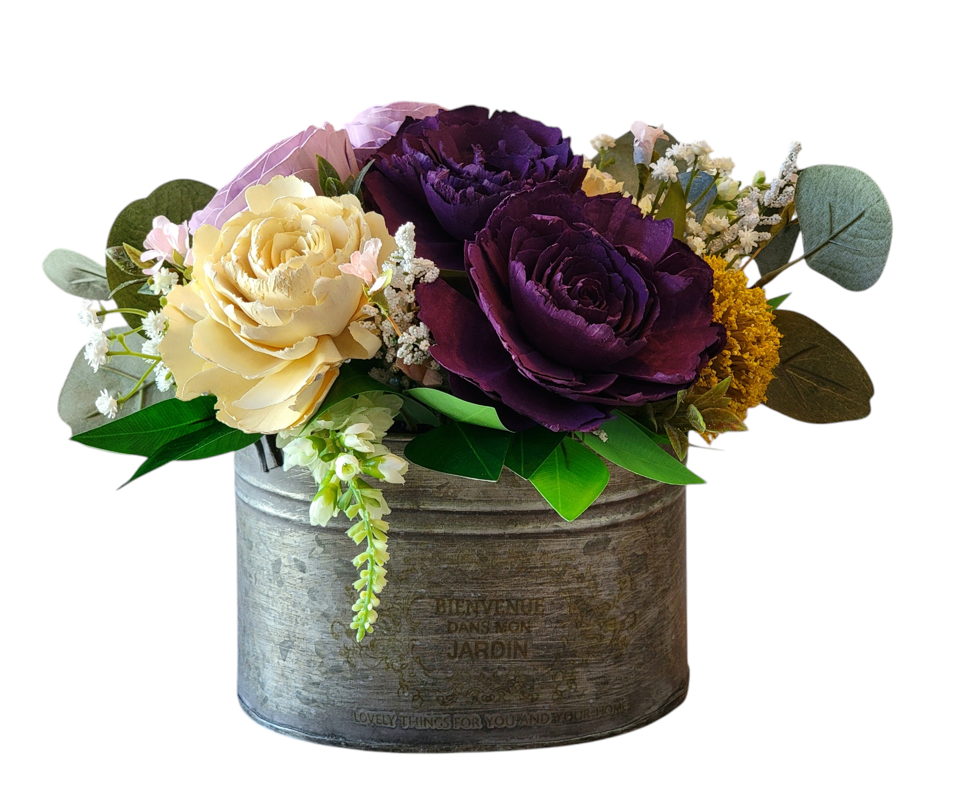 Bring a burst of color and charm to any space with our handcrafted wood flower arrangement, housed in a unique metal bucket container measuring approximately 6 3/4 x 5 x 4.5 inches. Standing approximately 8 inches high, this arrangement is the perfect size for any tabletop, shelf, or desk. It features a vibrant mix of purple and yellow wood flowers, designed to brighten up your home with a cheerful yet elegant touch.