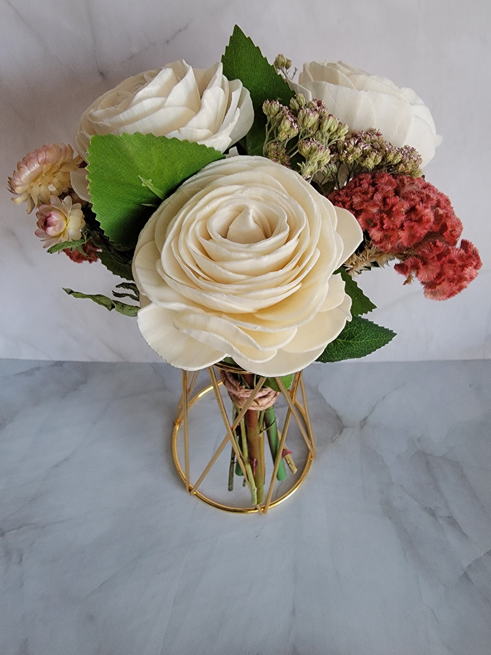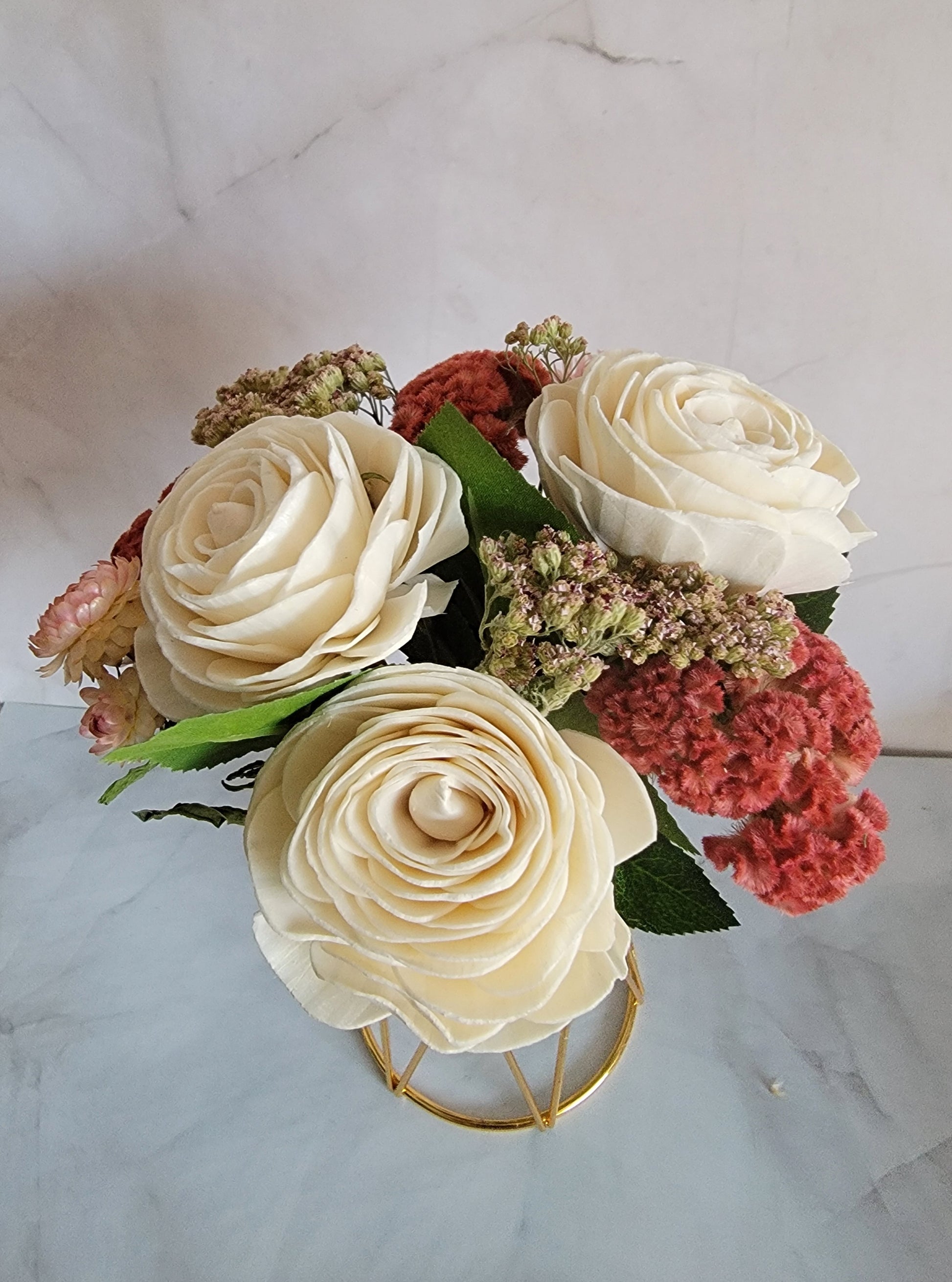 Made with wood flowers and carefully selected coordinating accents, these bouquets offer the charm of fresh florals with the lasting beauty you can enjoy for months (and years) to come. Every arrangement is hand-tied in our studio, making each piece uniquely beautiful.